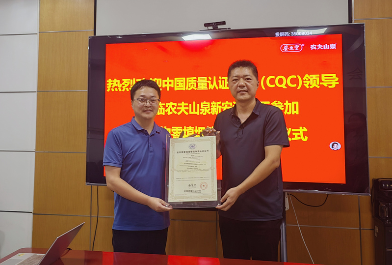 9月17日,中国质量认证中心认证与组织服务提升线市场部经理闫明磊、中检华东区域认证中心相关负责人一行赴农夫山泉(建德)新安江饮料有限公司,颁发中国质量认证中心(CQC)在华东区域的首张“废弃物零填埋管理体系”认证证书。此次认证标志着农夫山泉在绿色制造与可持续发展道路上迈出关键一步,也彰显了中国中检在推动产业绿色转型中的专业引领作用。